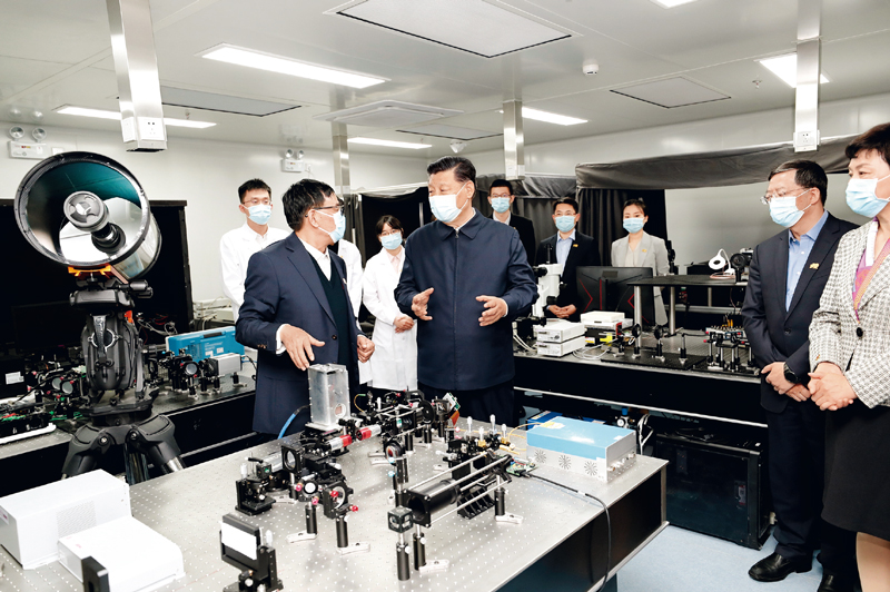 2021年4月19日,在清华大学建校110周年校庆日即将来临之际,中共中央总书记、国家主席、中央军委主席习近平来到清华大学考察。这是习近平在清华大学成像与智能技术实验室同师生们亲切交谈。新华社记者 黄敬文/摄